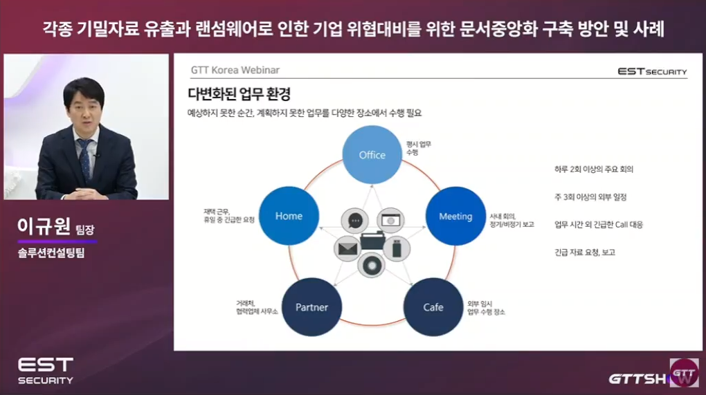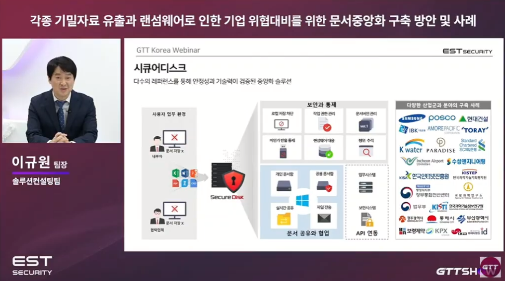 지난 26일, 이스트시큐리티는 GTT SHOW GTT Korea Webinar에서 '각종 기밀자료 유출과 랜섬웨어로 인한 기업 위협 대비를 위한 문서중앙화 구축 방안 및 사례'를 주제로 무료 온라인 세미나를 진행했습니다.