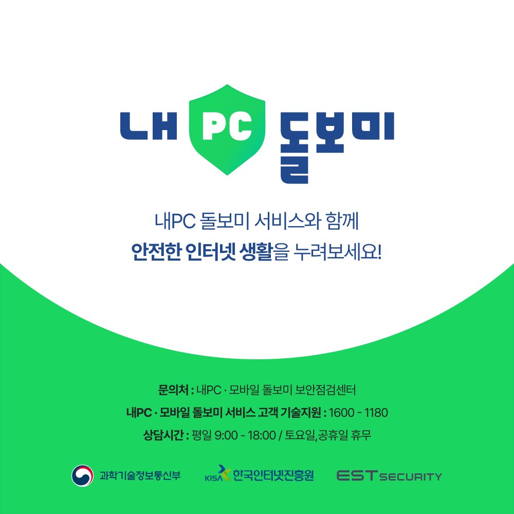 내 PC 돌보미 서비스란, 과학기술정보통신부가 한국인터넷진흥원과 함께 전국민 대상의 보안 강화를 위해 자동점검 방식을 도입하여 국민이 보안수준을 스스로 진단 할 수 있는 보안점검 서비스입니다.