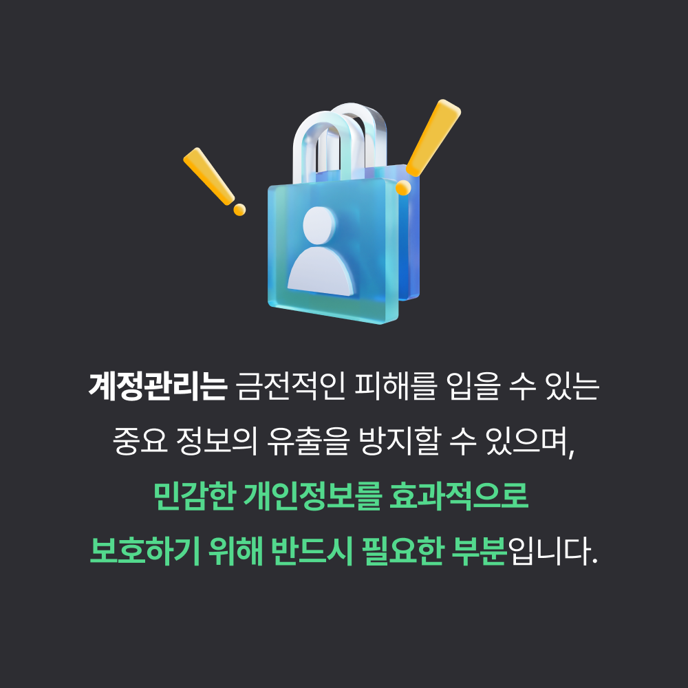 금전적인 피해를 입을 수 있는 민감한 개인정보를 효과적으로 보호하기 위해서는 PC 계정관리가 필수라는 점, 알고 계셨나요? 공격자로부터 내 PC의 개인정보를 안전하게 지키기 위한 계정관리 방법에 대해서 안내해 드리겠습니다.