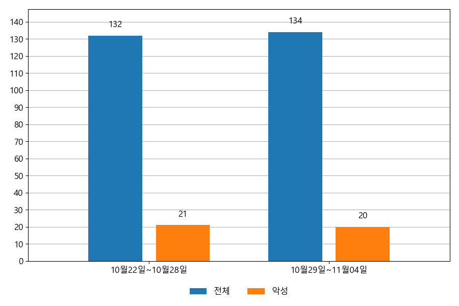 지난주 이메일 유입량은 총 134건이고 그중 악성은 20건으로 14.93%의 비율을 보였습니다. 악성 이메일의 경우 그 전주 21건 대비 20건으로 1건이 감소했습니다.