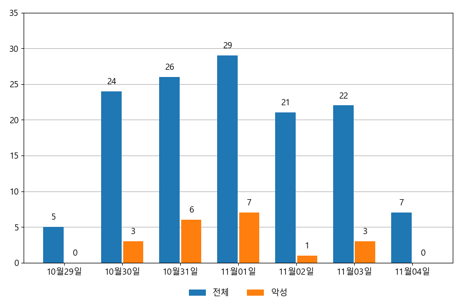 일일 유입량은 하루 최저 5건(악성 1건)에서 최대 29건(악성 7건)으로 일별 편차를 확인할 수 있습니다.