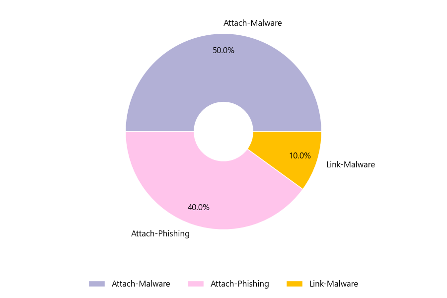 악성 이메일을 유형별로 살펴보면 20건 중 Attach-Malware형이 50.0%로 가장 많았고 뒤이어 Attach-Phishing형이 40.0%를 나타냈습니다.