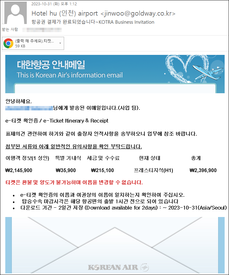 이번주 Pick으로는 국내 유명 항공권 e-티켓 사칭 Phishing 이메일을 선정했습니다. 이런 유형의 이메일은 코로나를 지나 국내 및 해외 여행이 활발해지자 꾸준히 발견되고 있습니다. 본문의 첨부파일은 클릭시 피싱 사이트로 접근되며 이메일 계정 정보를 훔쳐가도록 만들어져 있습니다. 관련 내용은 다음 글을 확인하시기 바랍니다.