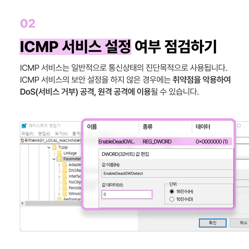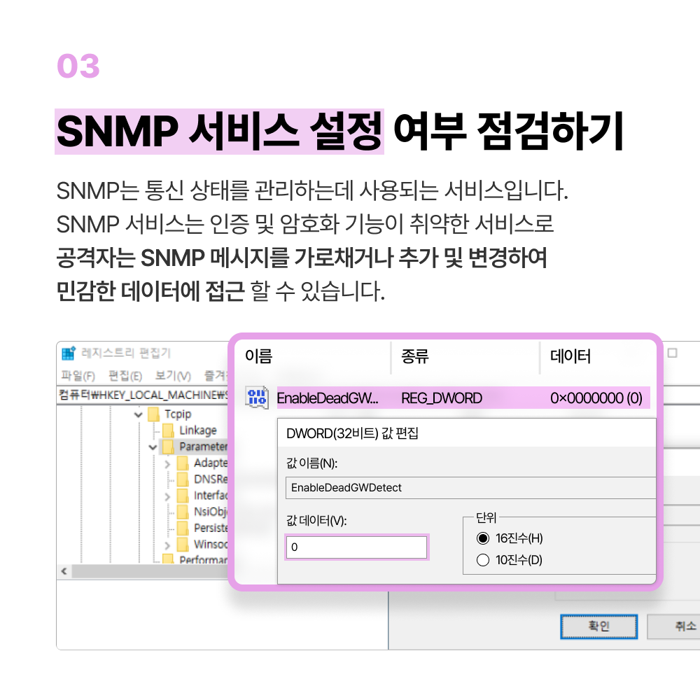 검색 버튼 클릭 ▶ "서비스" 입력 후 클릭 ▶ “SNMP 서비스”의 상태를 확인하고 “실행” 중일 경우, 더블 클릭하여 서비스 상태를 “중지”하고 시작 유형을 “사용 안 함”으로 변경 ▶ 검색 버튼 클릭 ▶ "레지스트리 편집기" 입력 후 클릭 ▶ 레지스트리 위치 이동 : 컴퓨터 > HKEY_LOCAL_MACHINE > System > CurrentControlSet > Services > Tcpip > Parameters ▶ “EnableDeadGWDetect” 값이 없는 경우 마우스 우클릭 후 “새로 만들기(N”) > “DWORD(32비트) 값(D)” 클릭 ▶ 이름 “EnableDeadGWDetect” 입력하여 생성 ▶ “EnableDeadGWDetect” 더블 클릭 > 값 데이터 “0” 입력 > “확인” 클릭