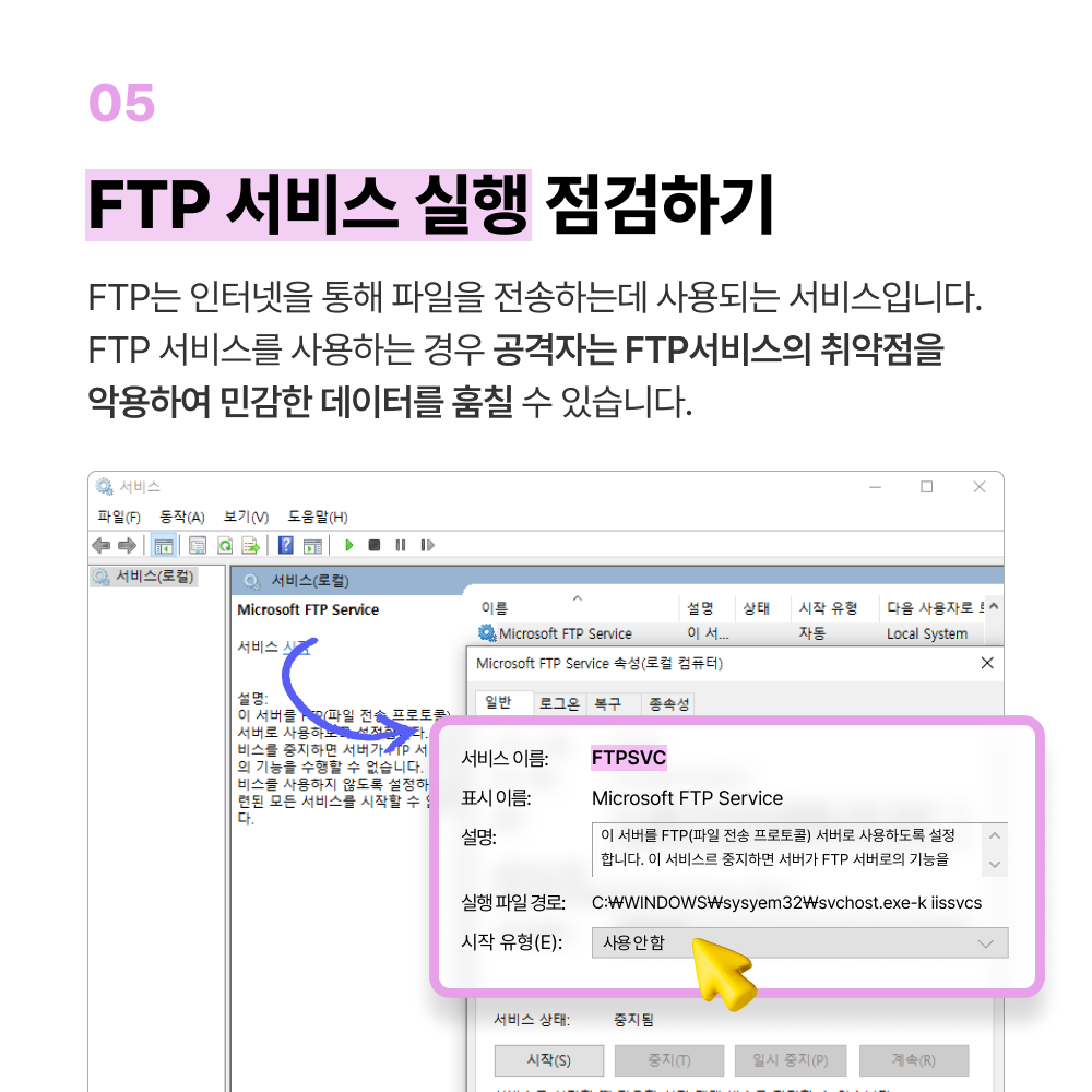 검색 버튼 클릭 ▶ "서비스" 입력 후 클릭 ▶ Microsoft FTP Service의 상태를 확인하고 “실행” 중일 경우, 더블 클릭하여 서비스 상태를“중지”하고 시작 유형을 “사용 안 함”으로 변경