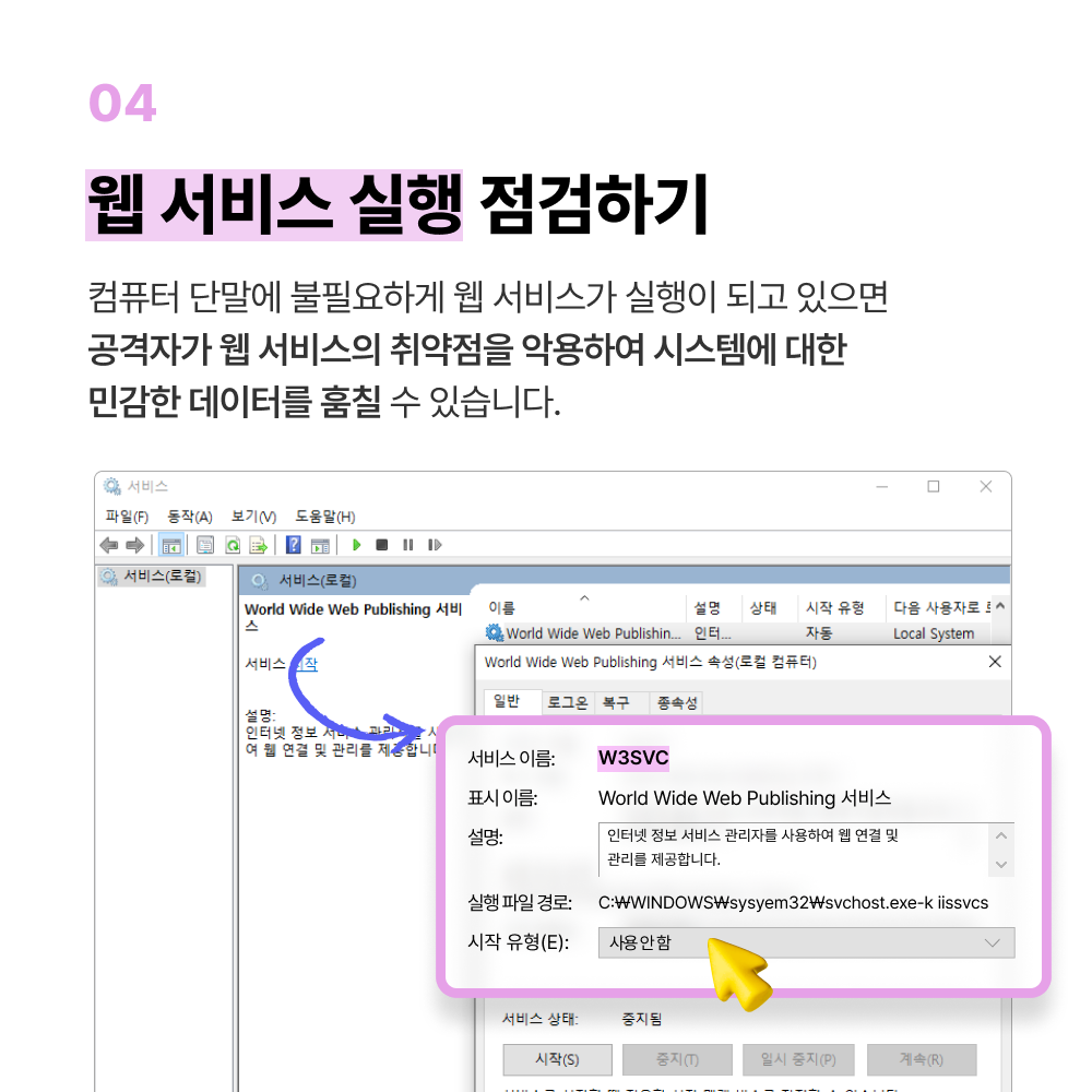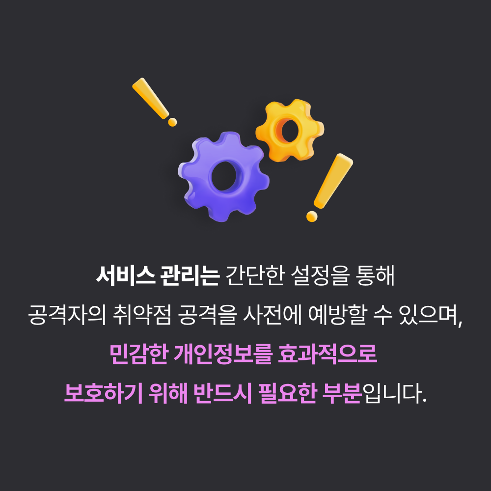 공격자로부터 내 PC의 개인정보를 효과적으로 보호하기 위해 서비스 관리가 필요합니다. 간단한 설정으로 취약점 공격을 사전에 예방할 수 있는 서비스 관리 방법에 대해 안내해 드리겠습니다.