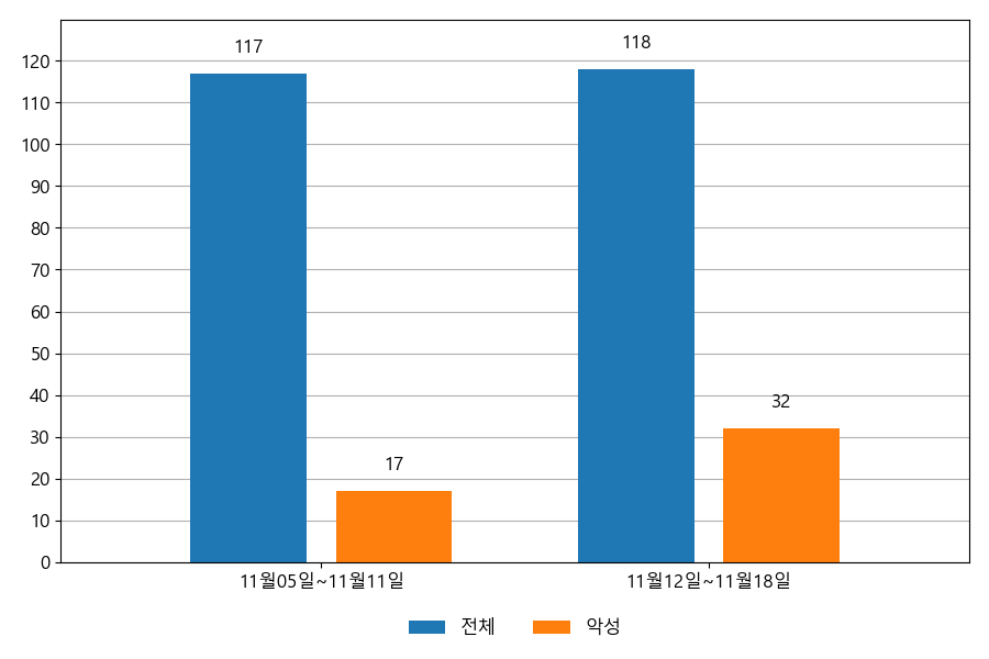 지난주 이메일 유입량은 총 118건이고 그중 악성은 32건으로 27.12%의 비율을 보였습니다. 악성 이메일의 경우 그 전주 17건 대비 32건으로 15건이 증가했습니다.