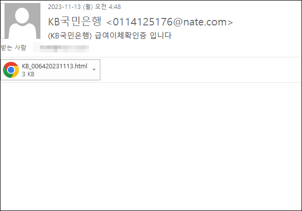 이번주 Pick으로는 다수 유포가 확인된 KB국민은행 사칭 Phishing 이메일을 선정했습니다. 이메일 제목은 "(KB국민은행) 급여이체확인증 입니다"로 본문에는 아무내용이 없으며 첨부파일만 존재하여 클릭을 유도하고 있습니다.