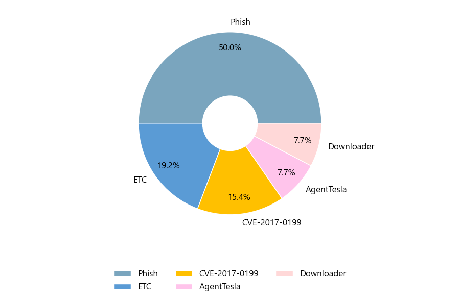 첨부파일은 ‘Phish’형태가 50.0%로 제일 큰 비중을 차지했고 뒤이어 ‘ETC’, ‘CVE-2017-0199’가 각각 19.2%, 15.4%의 비중을 차지했습니다.