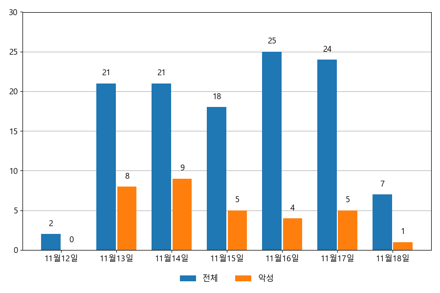 일일 유입량은 하루 최저 2건(악성 1건)에서 최대 25건(악성 9건)으로 일별 편차를 확인할 수 있습니다.