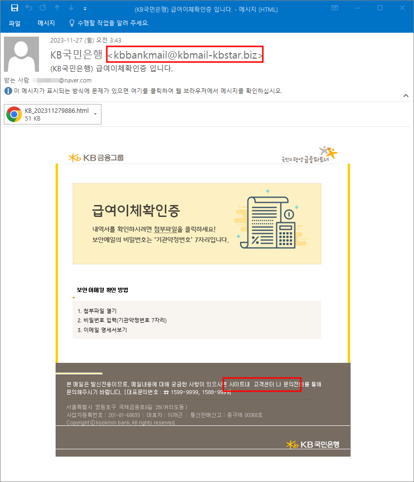 해당 피싱 메일은 "(KB국민은행) 급여이체확인증 입니다." 제목과 공식 logo 이미지 및 첨부파일 양식 등으로 손쉽게 사용자의 눈속임을 시도하였습니다. 하지만 조금만 더 꼼꼼히 살펴본다면, 공식 메일 계정을 짜깁기한 가짜 메일 계정과 하단 안내문의 허술한 띄어쓰기 등 피싱 메일일 가능성을 사전에 판단할 수 있습니다.
