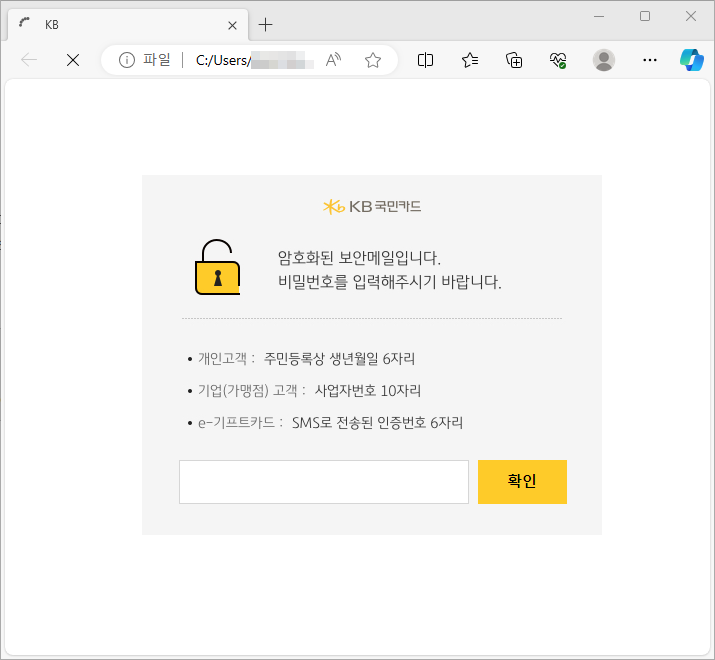 이메일에 첨부된 'KB_202311279886.html' 을 실행하면 아래와 같이 "암호화된 보안메일입니다. 비밀번호를 입력해주시기 바랍니다." 문구의 페이지로 연결되어 사용자의 개인정보를 요구하지만, 사실은 단순한 그림 파일이며 따로 정보를 기입하지 않더라도 몇 초가 지나면 사용자의 포털 계정 정보를 탈취하는 페이지로 자동 연결됩니다.