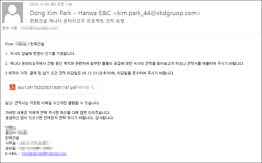 이번주 Pick으로는 국내 건설사를 사칭 유포 중인 Phishing 이메일을 선정했습니다. 이번 이메일은 '한화건설 캐나다 온타리오주 프로젝트 견적 요청'이라는 제목으로 유포가 되었으며 본문에는 pdf 파일을 다운로드 받도록 이미지가 포함되어있습니다. 이미지를 클릭시 제작자가 만든 사이트로 접근되며 로그인 메이지가 나타납니다. 이때 로그인과 패스워드를 기입하고 로그인 버튼을 클릭하면 해당 정보는 외부로 유출됩니다. 최근 이와 유사한 이메일 공격이 많이 확인되고 있으므로 본문 처럼 pdf파일을 확인할때 로그인을 유도하면 피싱을 주의해야하겠습니다.