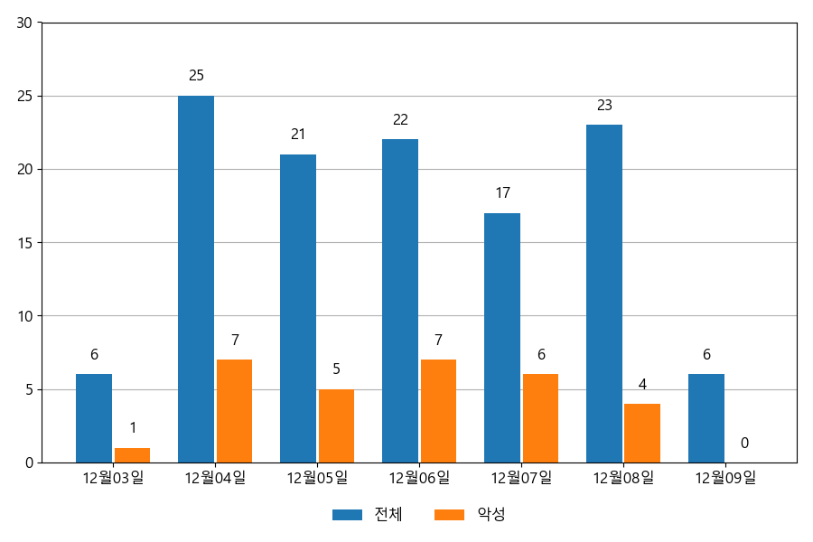 일일 유입량은 하루 최저 6건(악성 1건)에서 최대 25건(악성 7건)으로 일별 편차를 확인할 수 있습니다.