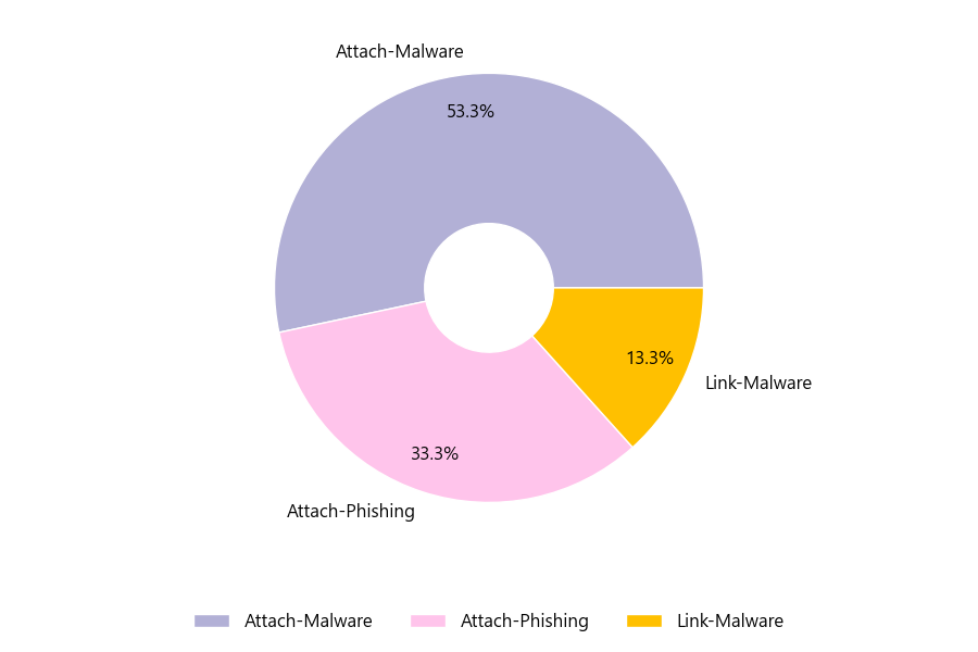 악성 이메일을 유형별로 살펴보면 30건 중 Attach-Malware형이 53.3%로 가장 많았고 뒤이어 Attach-Phishing형이 33.3%를 나타냈습니다.