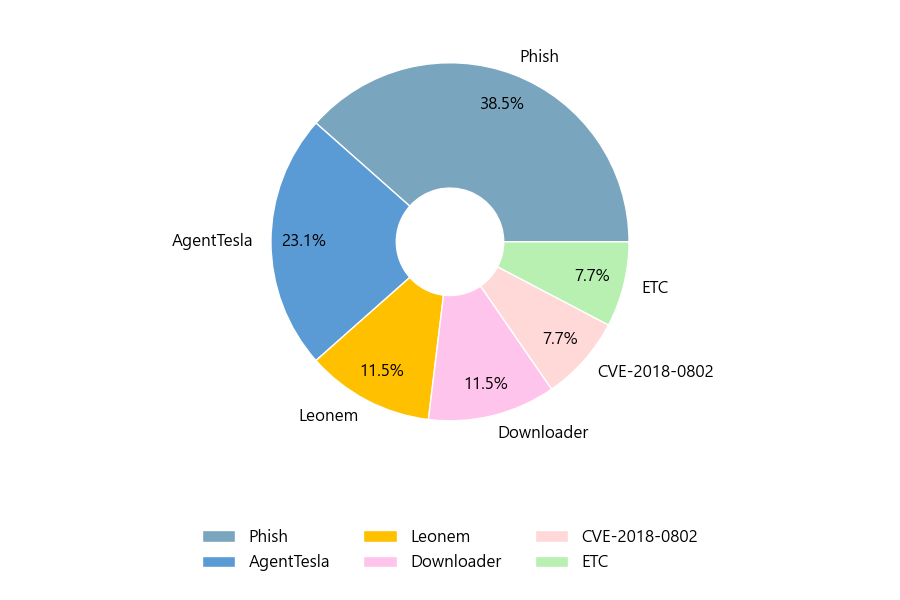 첨부파일은 ‘Phish’형태가 38.5%로 제일 큰 비중을 차지했고 뒤이어 ‘AgentTesla’, ‘Leonem’가 각각 23.1%, 11.5%의 비중을 차지했습니다.