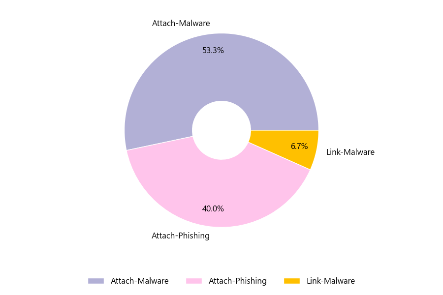 악성 이메일을 유형별로 살펴보면 15건 중 Attach-Malware형이 53.3%로 가장 많았고 뒤이어 Attach-Phishing형이 40.0%를 나타냈습니다.