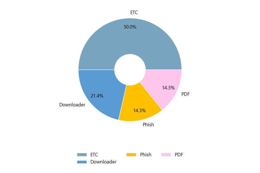 첨부파일은 ‘ETC’형태가 50.0%로 제일 큰 비중을 차지했고 뒤이어 ‘Downloader’, ‘Phish’가 각각 21.4%, 14.3%의 비중을 차지했습니다.