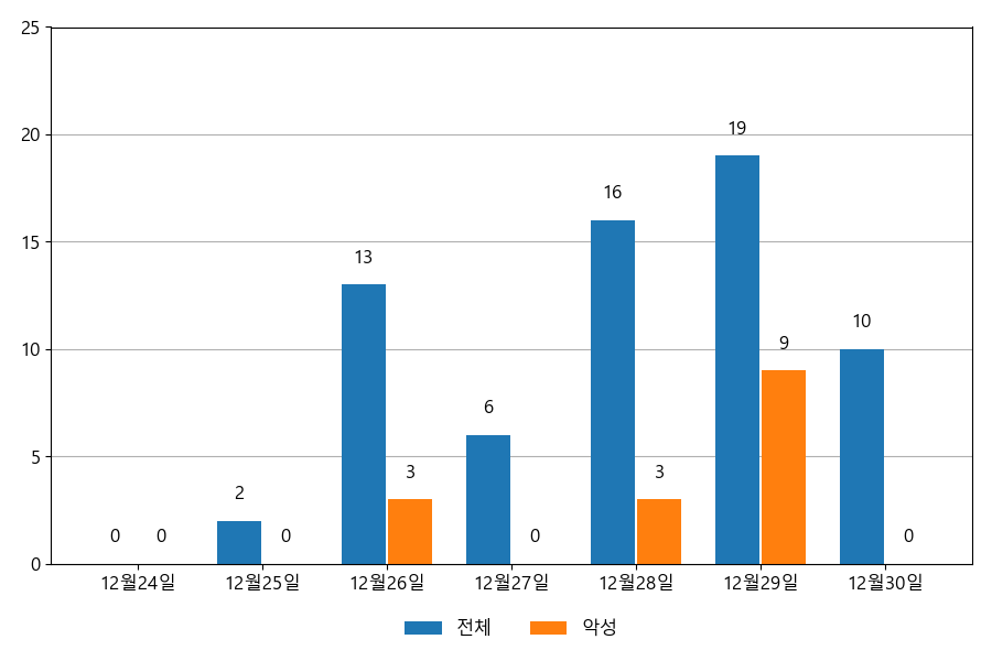 일일 유입량은 하루 최저 2건(악성 3건)에서 최대 19건(악성 9건)으로 일별 편차를 확인할 수 있습니다.