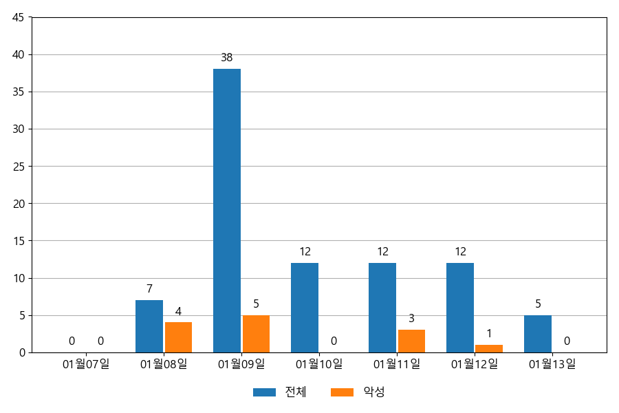 일일 유입량은 하루 최저 5건(악성 1건)에서 최대 38건(악성 5건)으로 일별 편차를 확인할 수 있습니다.