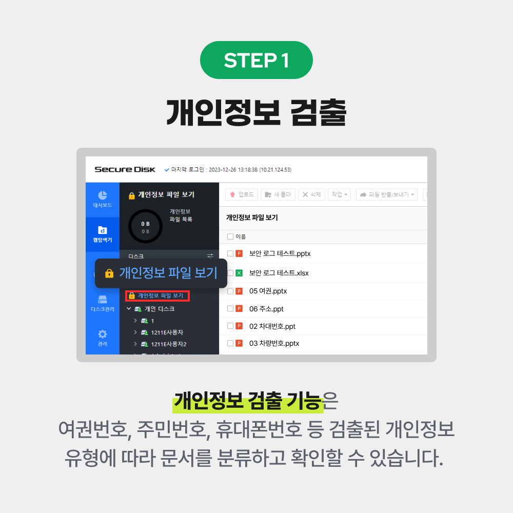 이스트시큐리티 문서중앙화 솔루션 '시큐어디스크', '인터넷디스크'에서는 개인정보 검출부터 조회, 분류까지 가능해 민감한 개인정보가 담긴 모든 문서를 안전하게 관리할 수 있습니다.