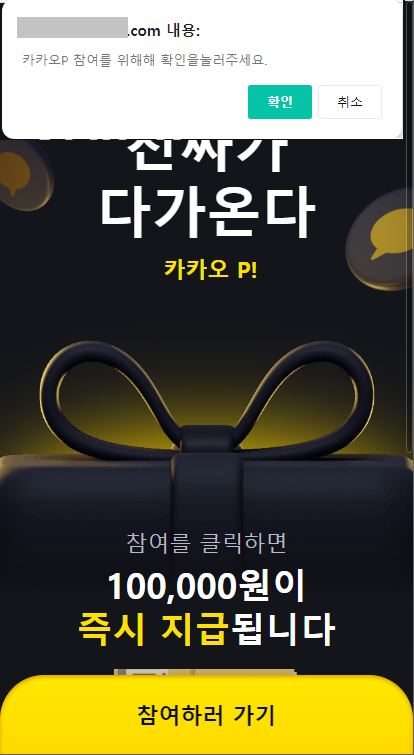 사용자가 피싱 페이지 하단에 [참여하러가기] 버튼을 누르면 '카카오P 참여를 위해해 확인을눌러주세요'라는 팝업이 뜨며, 확인을 누르면 apk가 다운로드 됩니다.
