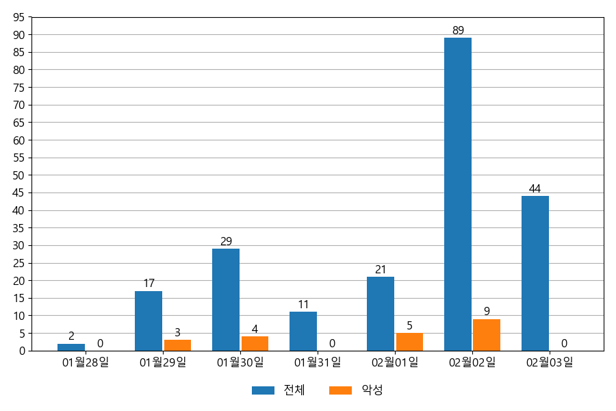 일일 유입량은 하루 최저 2건(악성 3건)에서 최대 89건(악성 9건)으로 일별 편차를 확인할 수 있습니다.