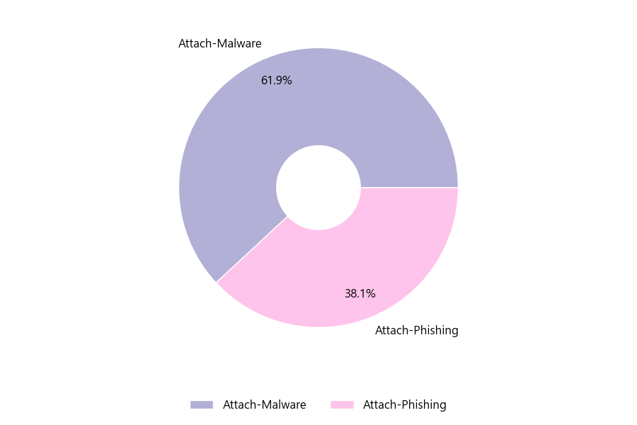 악성 이메일을 유형별로 살펴보면 21건 중 Attach-Malware형이 61.9%로 가장 많았고 뒤이어 Attach-Phishing형이 38.1%를 나타냈습니다.
