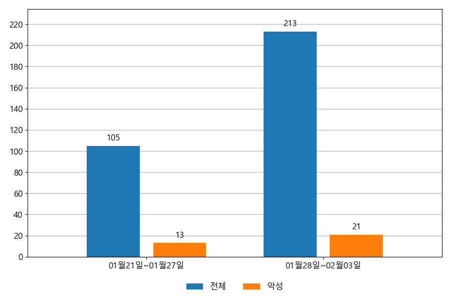 지난주 이메일 유입량은 총 213건이고 그중 악성은 21건으로 9.86%의 비율을 보였습니다. 악성 이메일의 경우 그 전주 13건 대비 21건으로 8건이 증가했습니다.
