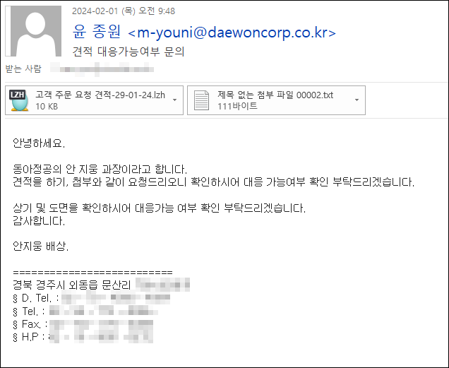 이번주 Pick으로는 국내 기업을 사칭하여 악성코드를 유포 중인 이메일을 선정했습니다. 이번 이메일은 '견적 대응가능여부 문의'라는 제목으로 보내졌으며 첨부파일을 확인하도록 유도하고 있습니다. 압축된 첨부파일의 경우 VBS확장자의 악성 파일이 포함되어 있어습니다. 이는 외부로부터 파일을 다운로드하는 악성코드로 또다른 악성코드가 설치될 수 있습니다. 견적 확인 관련 이메일은 꾸준히 유포되고 있으므로 이와 유사한 이메일을 확인시 항상 주의를 기울여야 겠습니다.