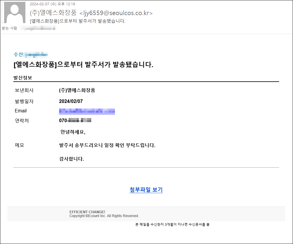 ㆍ[엘에스화장품]으로부터 발주서가 발송됐습니다.