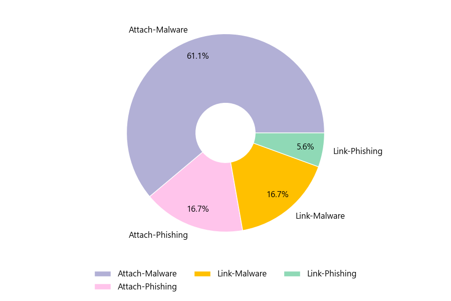 악성 이메일을 유형별로 살펴보면 18건 중 Attach-Malware형이 61.1%로 가장 많았고 뒤이어 Attach-Phishing형이 16.7%를 나타냈습니다.