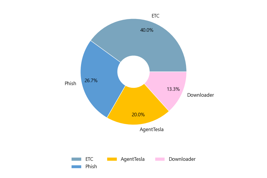 첨부파일은 ‘ETC’형태가 40.0%로 제일 큰 비중을 차지했고 뒤이어 ‘Phish’, ‘AgentTesla’가 각각 26.7%, 20.0%의 비중을 차지했습니다.