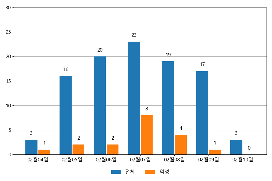 일일 유입량은 하루 최저 3건(악성 1건)에서 최대 23건(악성 8건)으로 일별 편차를 확인할 수 있습니다.