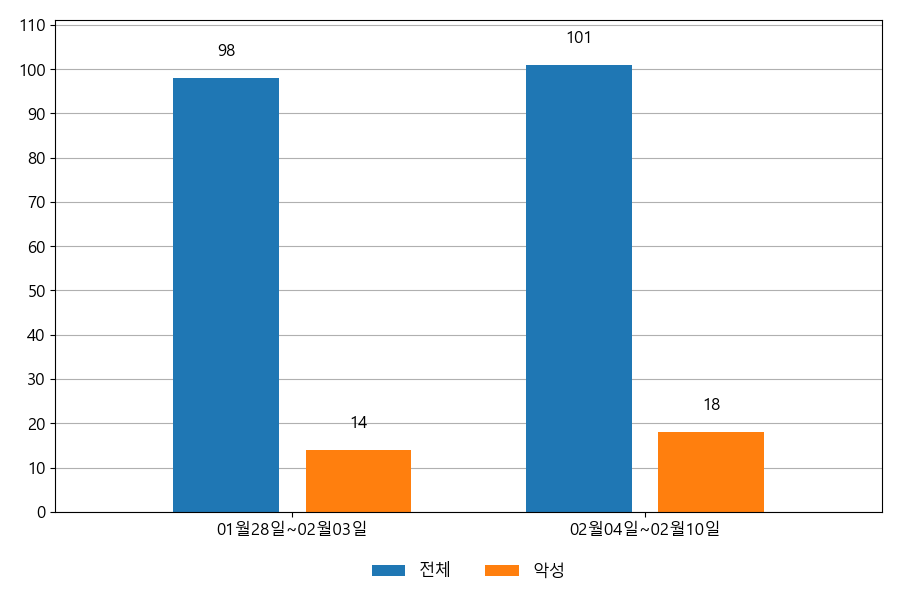 지난주 이메일 유입량은 총 101건이고 그중 악성은 18건으로 17.82%의 비율을 보였습니다. 악성 이메일의 경우 그 전주 14건 대비 18건으로 4건이 증가했습니다.