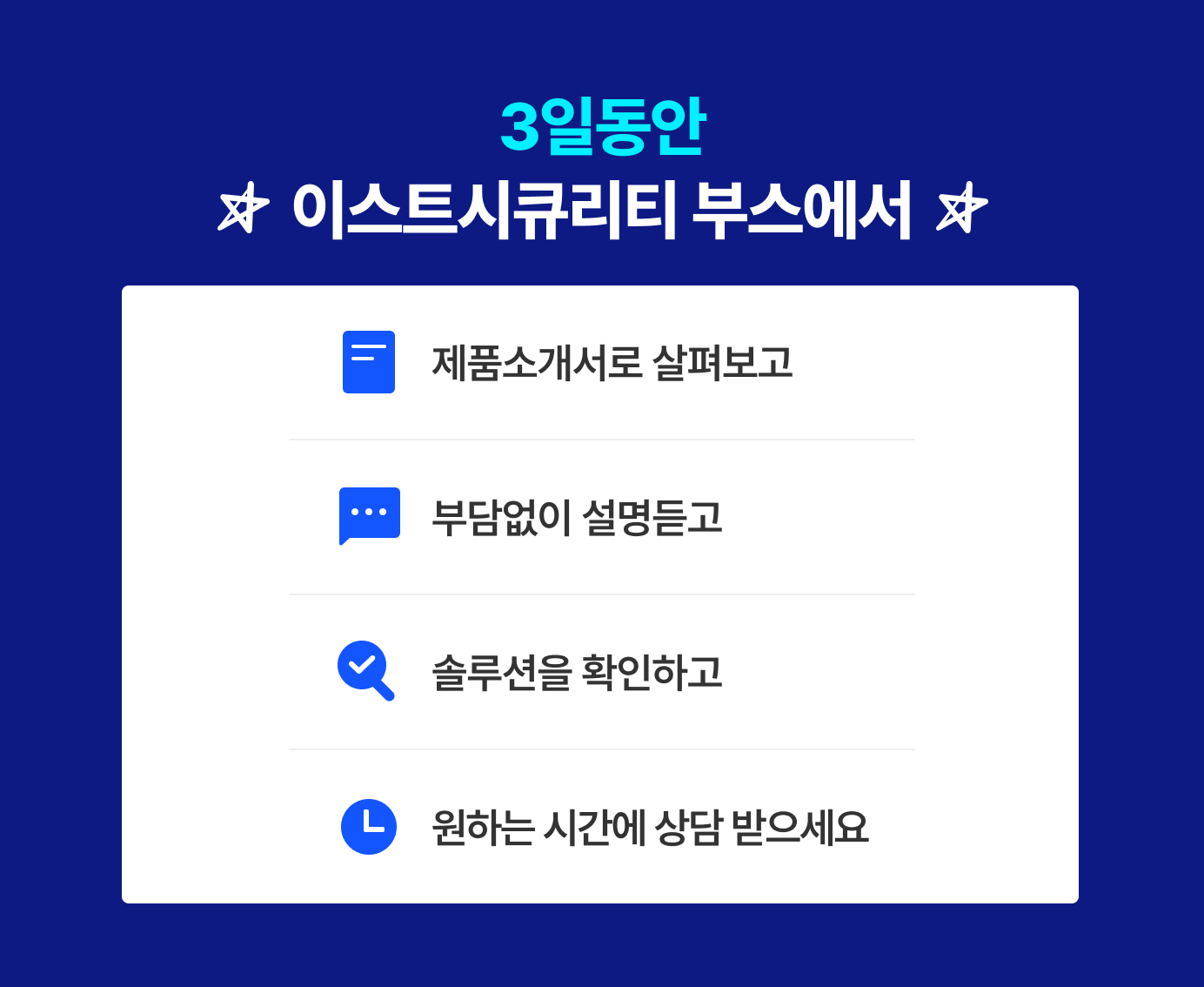 이스트시큐리티 부스에 오시면 알약 및 알약 EDR을 통해 조직 내 엔드포인트 보안 가시성을 확보하는 방법을 직접 확인하실 수 있으며, 문서중앙화 솔루션 시큐어디스크, 인터넷디스크를 통해 데이터 외부 유출 방지와 업무 생산성을 동시에 유지하는 방법을 보여드립니다.