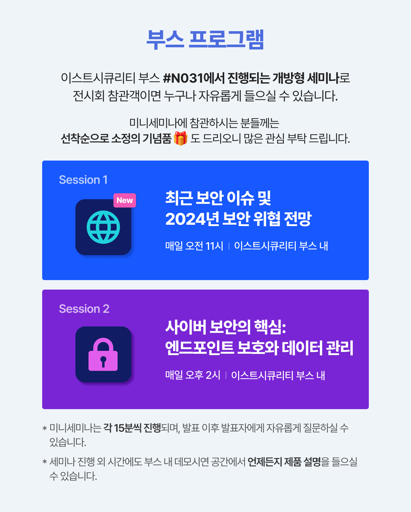 이스트시큐리티가 준비한 미니세미나는 각 15분씩 진행되며, 세미나 이후 발표자에게 자유롭게 질문하실 수 있습니다. 그 외에도 언제든 부스 내 데모시연 공간에서 제품 소개와 시연을 받으실 수 있으니, 이스트시큐리티 부스로 방문하시어 각 기업과 기관에 꼭 필요한 보안 솔루션에 대한 상담과 안내를 받아보시고 다양한 기념품도 받아가시기 바랍니다.