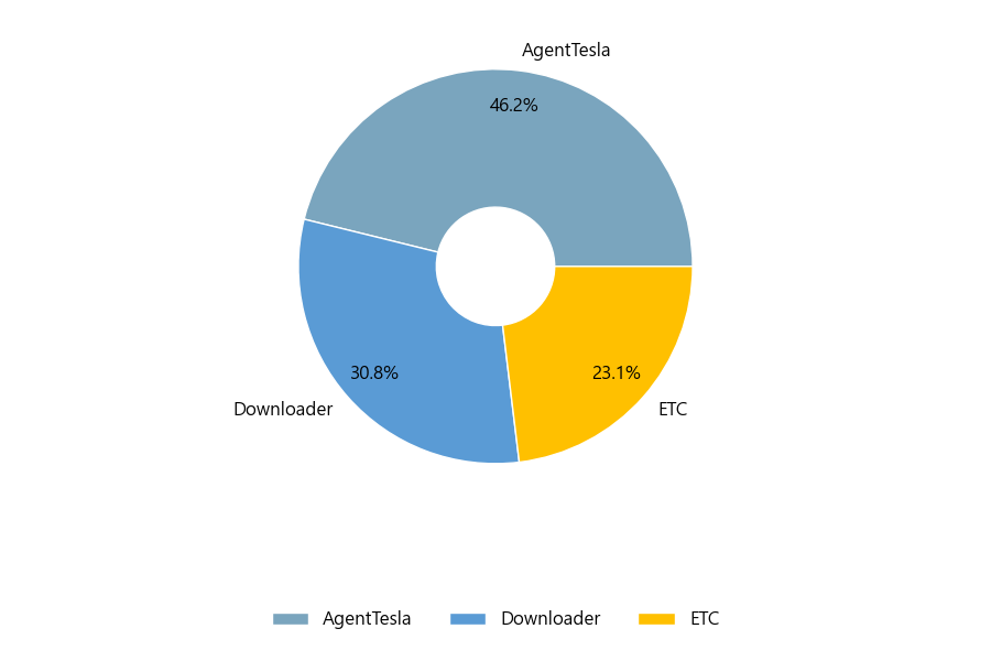 첨부파일은 ‘AgentTesla’형태가 46.2%로 제일 큰 비중을 차지했고 뒤이어 ‘Downloader’, ‘ETC’가 각각 30.8%, 23.1%의 비중을 차지했습니다.