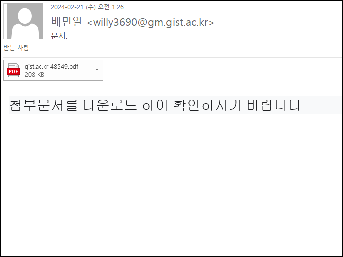 이번주 Pick으로는 대학 메일계정을 이용하는 Phishing 이메일을 선정했습니다. 이번 이메일은 특정 대학교의 이메일 계정을 사용하고 있으며, pdf 첨부파일을 통해 피싱을 수행한다. 특히 받는 사람이 없는 것 처럼 보이지만 헤더 'X-Original-RCPTTO' 정보를 통해 또다른 대학 계정 다수에 보내진 걸 확인할 수 있습니다.
