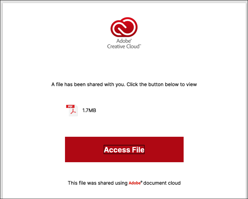 첨부파일을 확인하면 PDF문서를 보기위해 'Access File' 버튼을 클릭하도록 유도하는데, 버튼 클릭시 피싱 사이트로 연결됩니다. 이렇게 첨부파일 문서를 활용한 피싱 방법은 매우 다양한 형태를 사용하기 때문에 이와 유사한 이메일을 확인 시에는 항상 주의해야겠습니다.