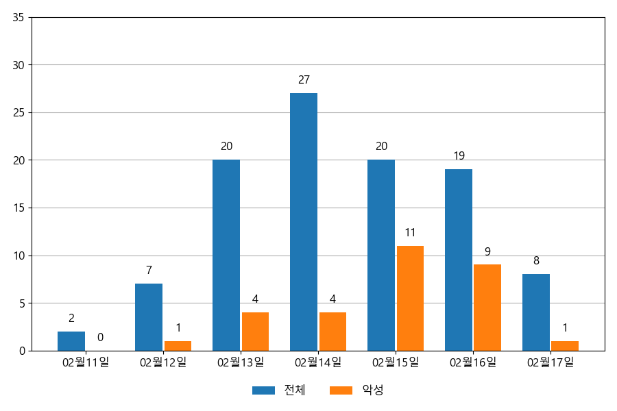 일일 유입량은 하루 최저 2건(악성 1건)에서 최대 27건(악성 11건)으로 일별 편차를 확인할 수 있습니다.