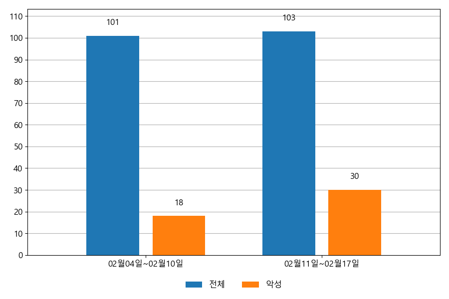 지난주 이메일 유입량은 총 103건이고 그중 악성은 30건으로 29.13%의 비율을 보였습니다. 악성 이메일의 경우 그 전주 18건 대비 30건으로 12건이 증가했습니다.
