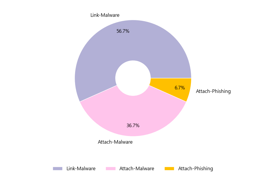 악성 이메일을 유형별로 살펴보면 30건 중 Link-Malware형이 56.7%로 가장 많았고 뒤이어 Attach-Malware형이 36.7%를 나타냈습니다.