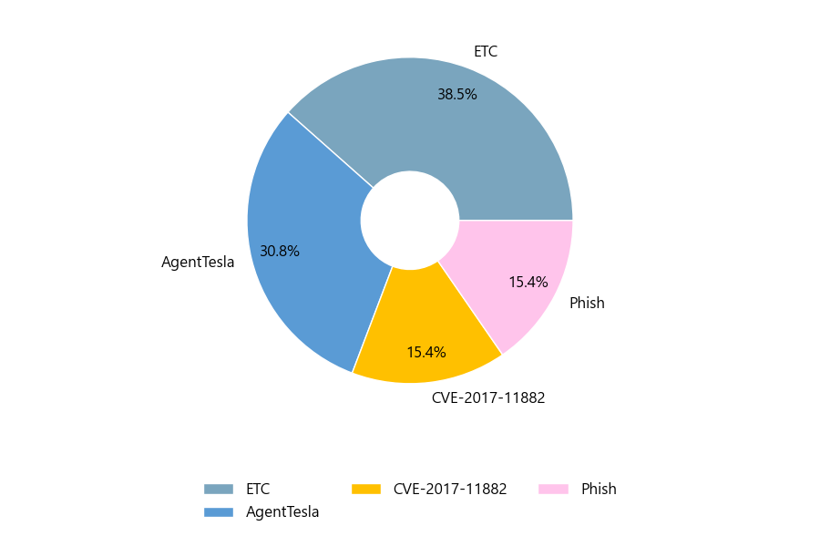 첨부파일은 ‘ETC’형태가 38.5%로 제일 큰 비중을 차지했고 뒤이어 ‘AgentTesla’, ‘CVE-2017-11882’가 각각 30.8%, 15.4%의 비중을 차지했습니다.