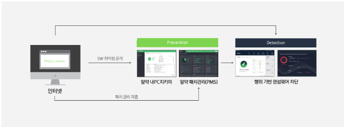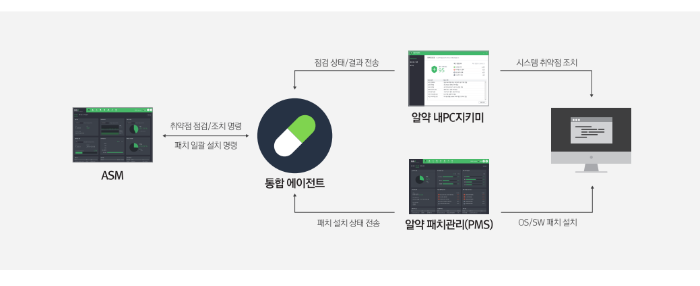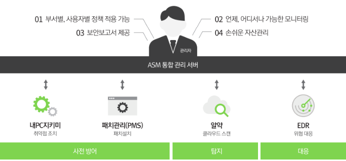 알약 통합 보안 솔루션은 사전 방어부터 신속한 탐지와 대응으로 고도화된 각종 위협들에 맞서, 보다 강력하고 빈틈 없는 엔드포인트 통합 보안을 구현합니다. 엔드포인트에서 발생한 각종 정보들은 ASM을 통해 일괄적으로 수집 및 관리됩니다.