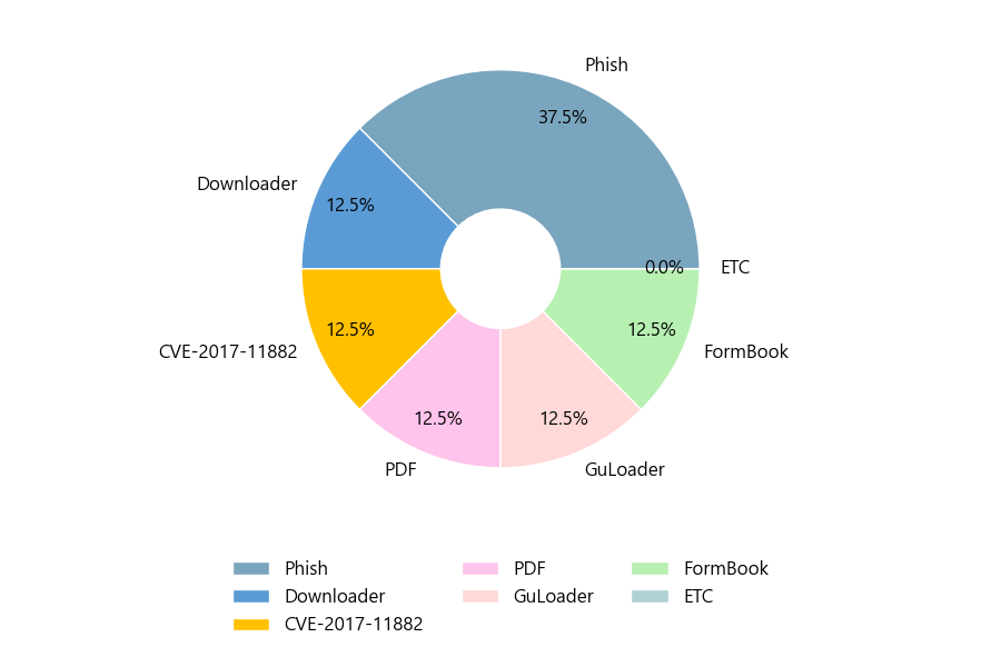 첨부파일은 ‘Phish’형태가 37.5%로 제일 큰 비중을 차지했고 뒤이어 ‘Downloader’, ‘CVE-2017-11882’가 각각 12.5%, 12.5%의 비중을 차지했습니다.