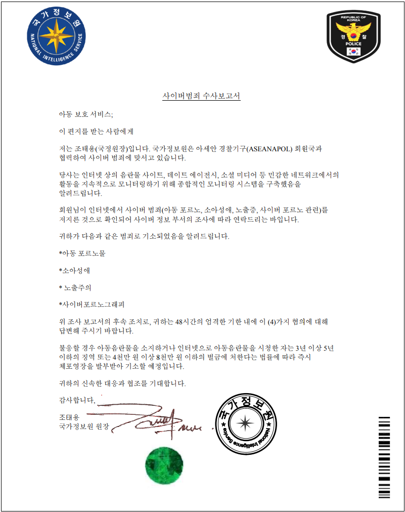 또한 첨부파일 분석결과 경찰 보고서를 사칭한 부분 외에 다른 악성행위는 없는 것으로 확인되었습니다.