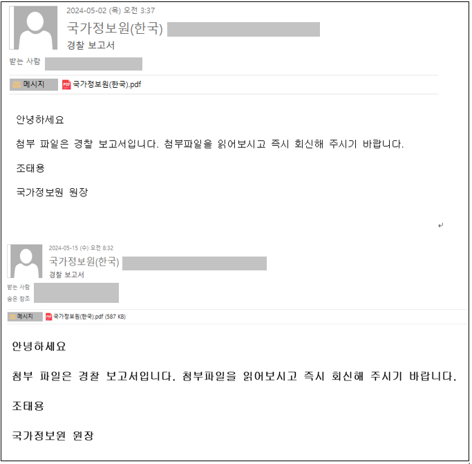해당 피싱 메일은 여전히 ‘ 경찰보고서’ 라는 제목으로 발신자명을 국가정보원으로 위장하여 발송되었으며, ‘국가정보원(한국).pdf’ 파일이 첨부되어 있습니다.